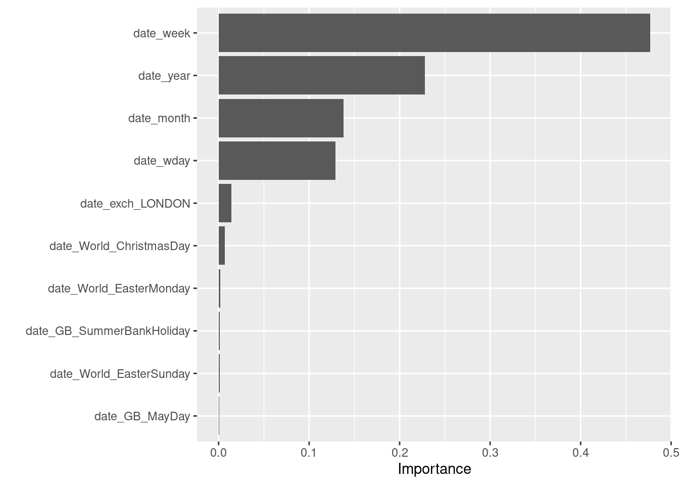 For the XGBoost model, the week of the year gives the biggest gain in performance, followed by the year, then the month and the weekday. All of the holiday features have much less importance - maybe not so surprising since they only give improvement for a single day.