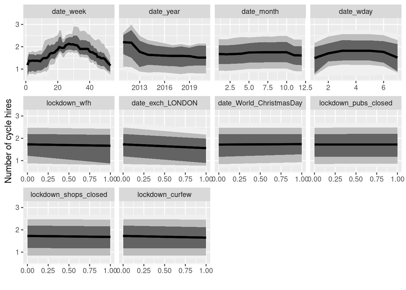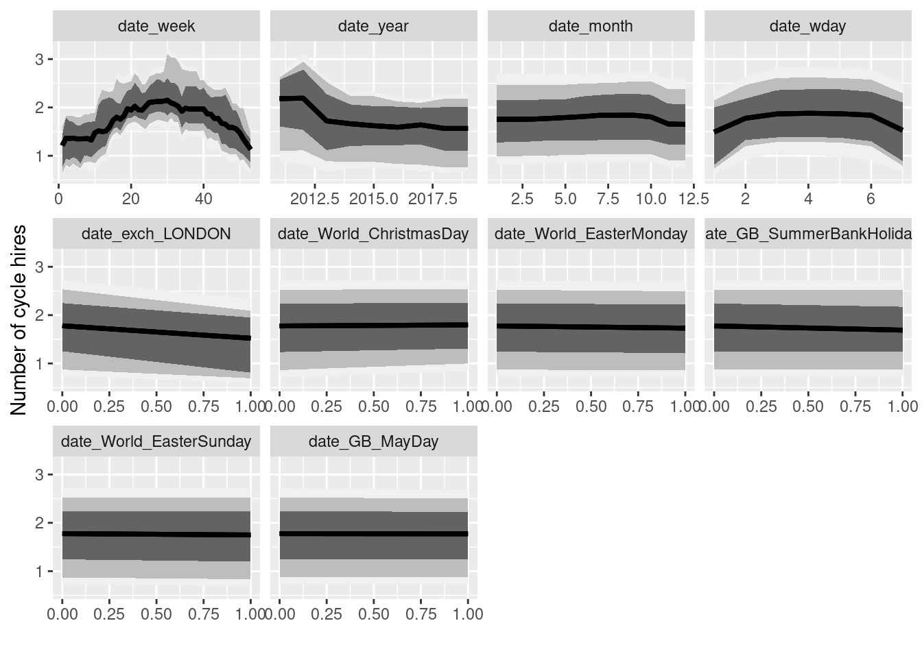 The first few partial dependence plots look very similar to the Prophet components, with added information about the effect of our holiday features. I found it pretty interesting that there’s an uptick in people using the cycle hires on Christmas day.